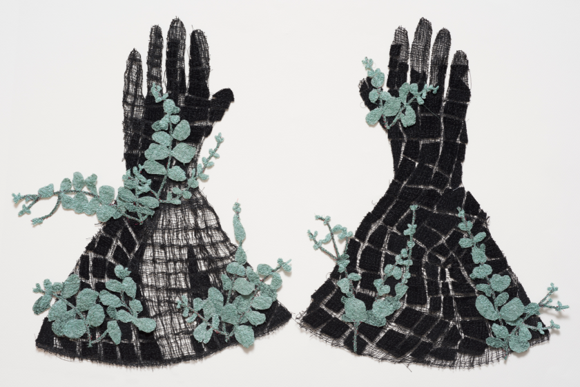 Sharon’s textile works in the exhibition stitch the melodies from the valley into embroidery that reflect the physicality of nature. Peoples has returned to the iconic motif of gardening gloves that pervades her practice in order to visually capture the sounds that she experienced.