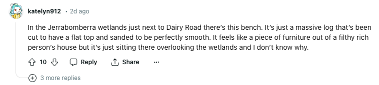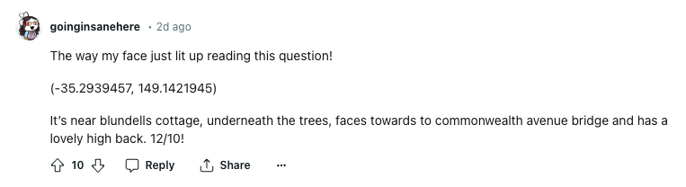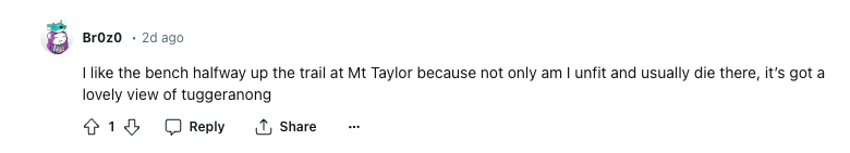 No, people were really having a serious debate about Canberra’s best benches in the r/canberra subreddit and honestly, it warmed my heart a little.