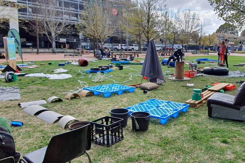 “This is an event that runs from 10 am to 4 pm daily and is completely free, so you can drop in at any time, and there’s just so much for kids to explore – huge crates of interesting stuff like tires, hoops, poles, soft play items like shapes for kids to climb.”