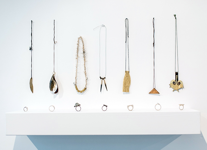 Pendants and rings made by Beverly Smith, Samual Radoll, Angie Davis, Krystal Hurst, Jennifer Kamarre Martiniello, Kayannie Denigan, Emily Beckley in the Indigenous Craft + Design residency and workshop program, 2018. Photo: 5foot Photography.