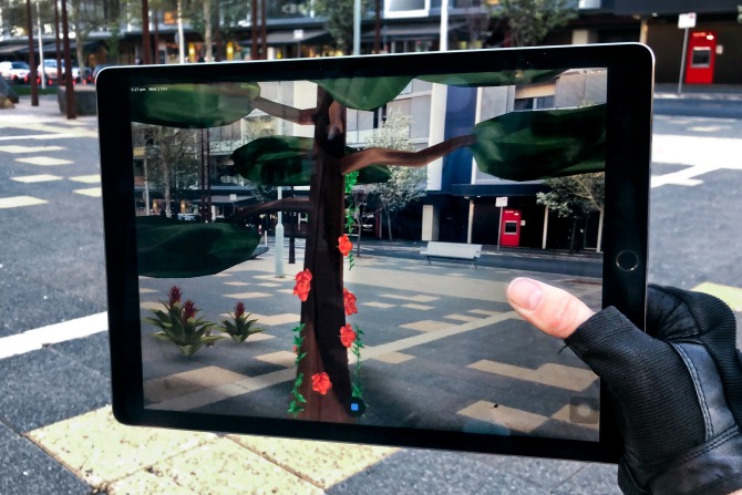 An augmented reality digital forest in Garema Place, created by artist Daniel Savage. Experience a shared digital environment that overlaps with the physical world and plays with unique landmarks in our city centre.