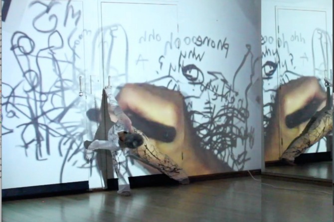 Live drawing is projected onto the walls of the performance space as the artists take their cues from each other to create movement, music and imagery, fully immersed in real-time performance creation.