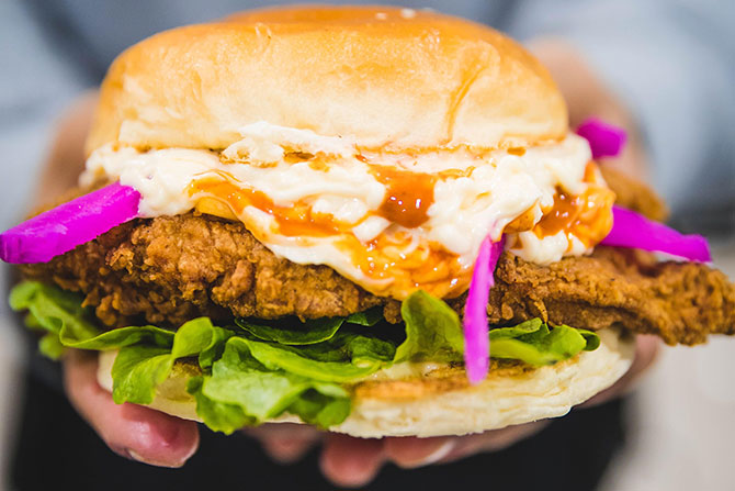 Menu items include Fried Tawook—a succulent fried chicken burger that combines Lebanese flavours, like pickled turnips with fried chicken, jack cheese and garlic aioli, and the Al Falafel—house made falafel, hummus, tomato, sumac onions and pickles on fresh Lebanese bread (P.S. it’s vegan).