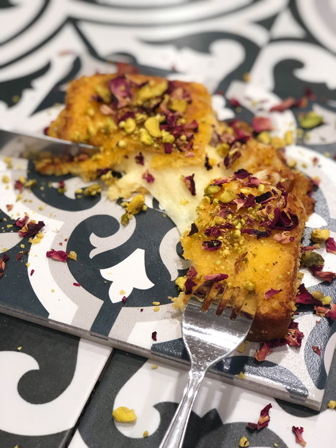 But my personal favourite is the Knafeh French Toast—a cheeky twist on the traditional sweet cheese pastry, topped with pistachios and delightful rose water syrup.