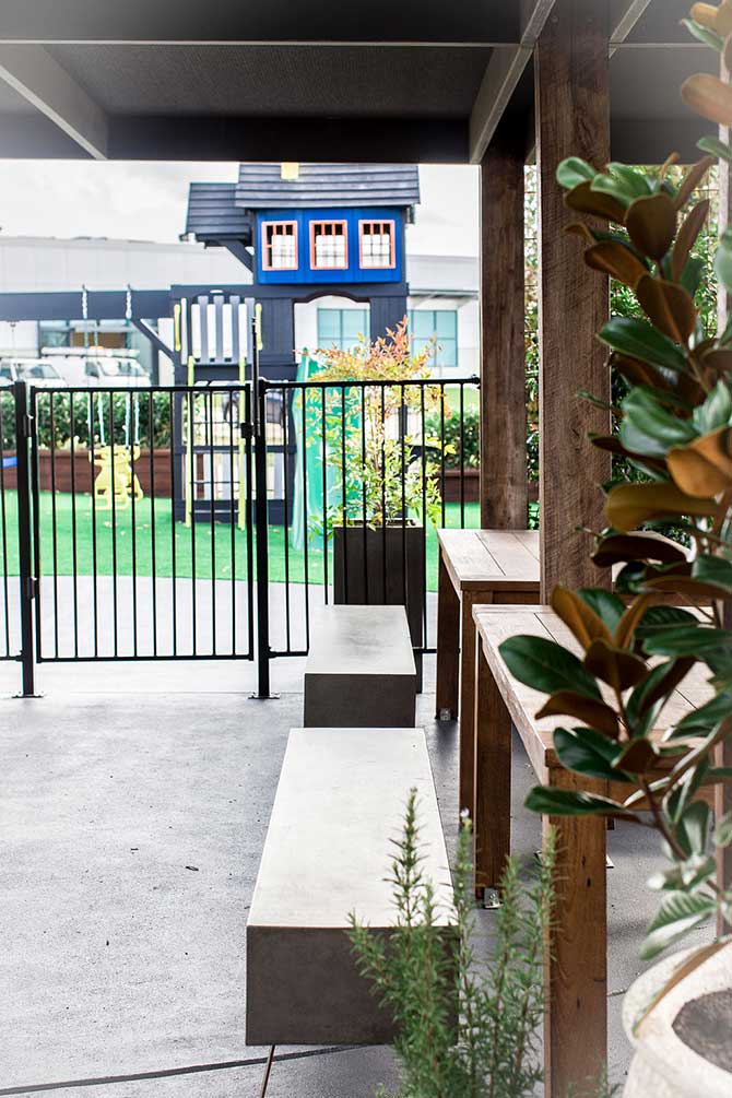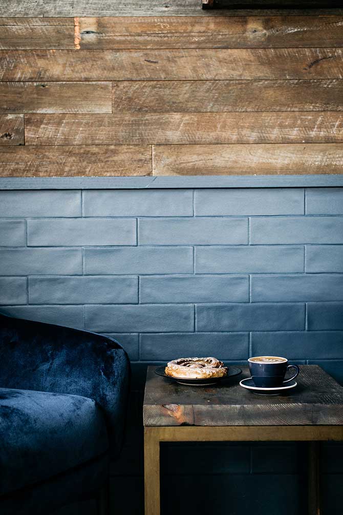 Wildflour is all dark tiles, wood and blue velvet chairs with some beautiful plant life creating a focal point on the ceiling. It seems a big space and yet exudes warmth and community through long bars, communal tables and a large and safety-gated children’s playground outside.