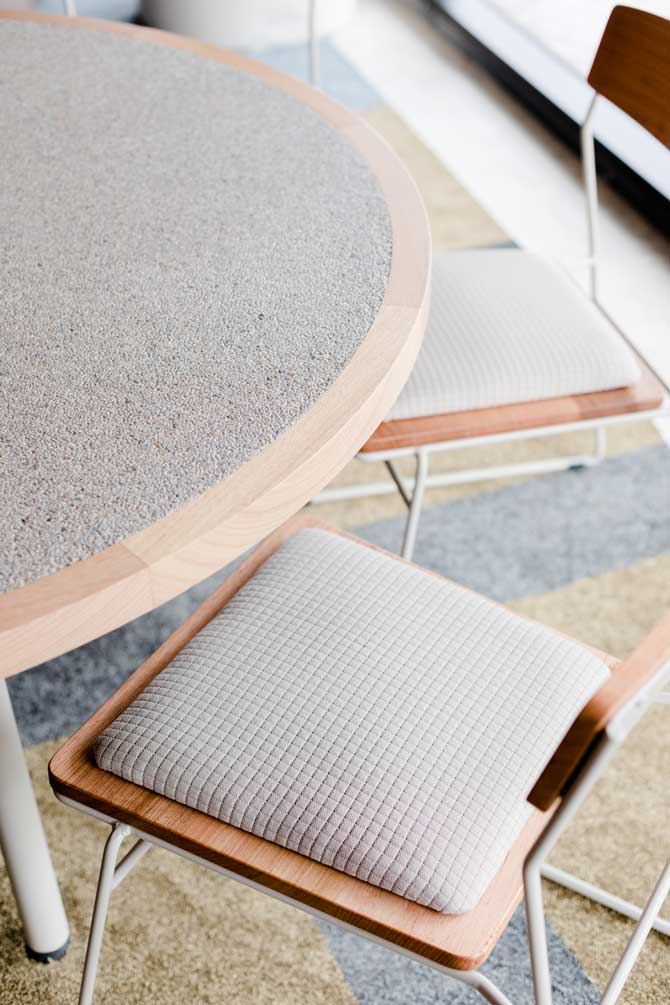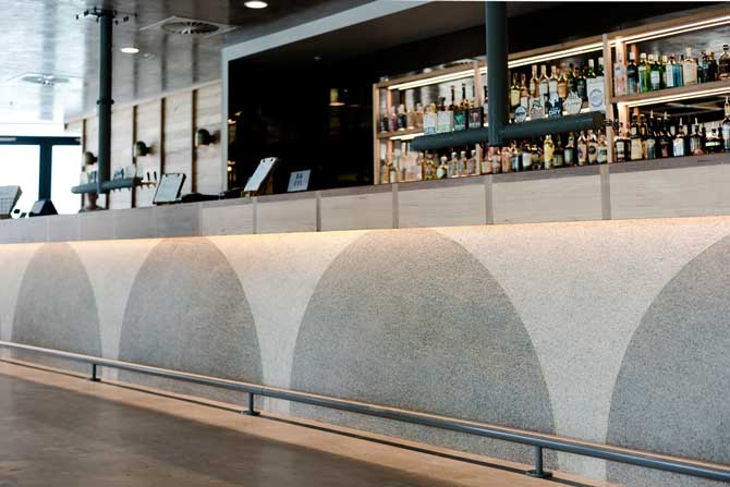 The result is a bright, airy space with high ceilings that bring the outside indoors. Twinkling above, specially-crafted light fittings give a nod to ANU’s Observatory, while both the 13-metre pebblecrete bar and circular dining tables have been designed with a subtle reference to the Shinedome’s iconic curved roof and finish. Recycled ash timber has been used throughout to symbolise the university’s bush campus, with tight sustainability parameters meaning recycled materials were used wherever possible.
