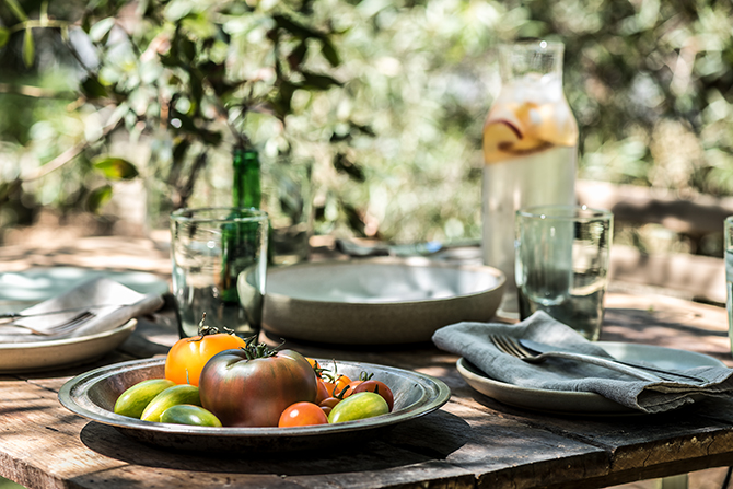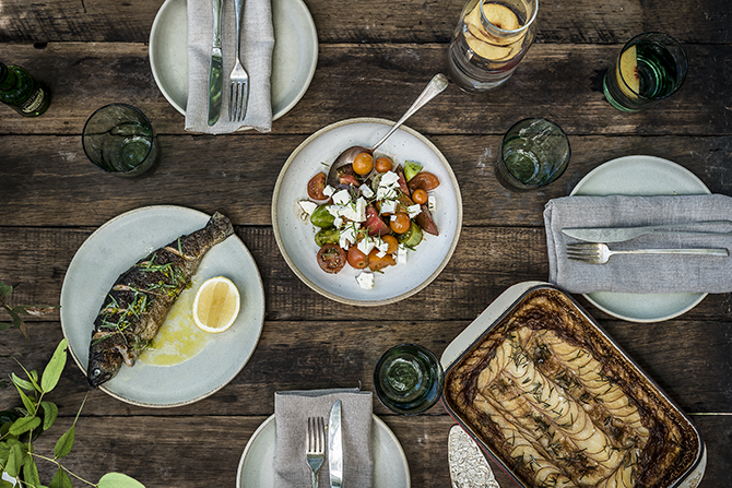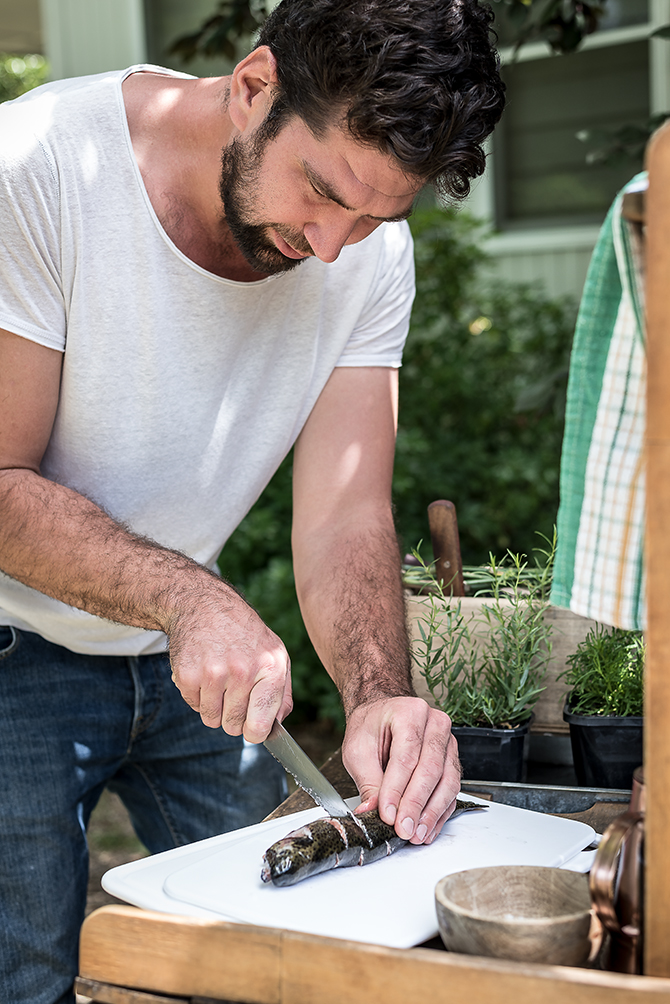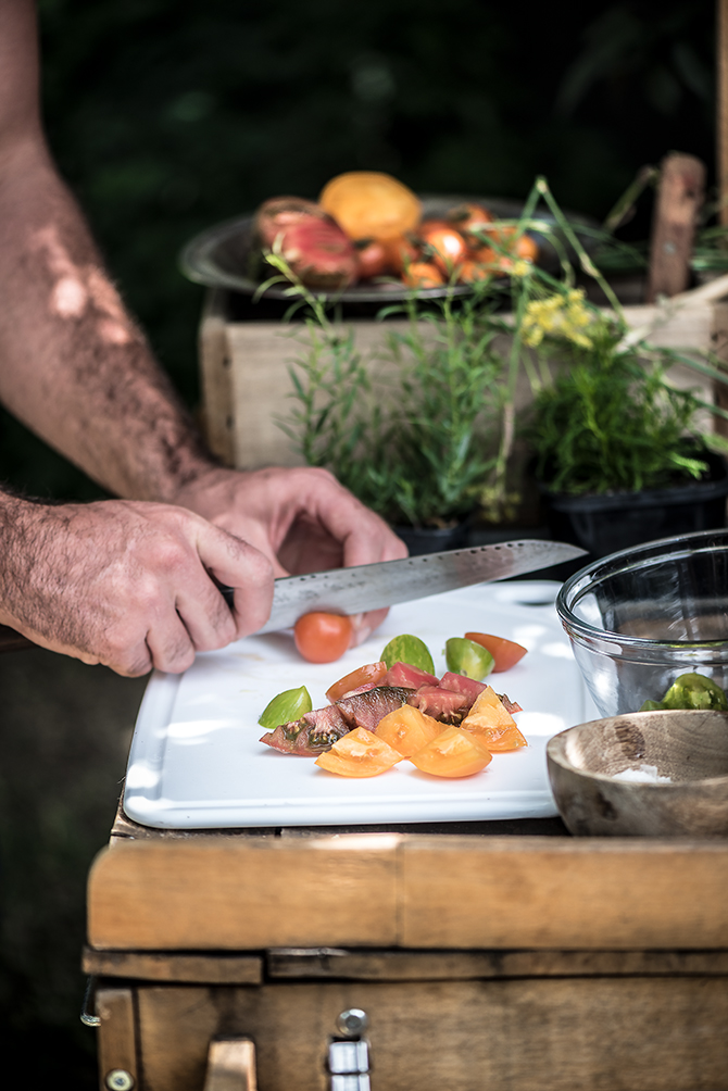 Whole grilled fish is as simple as it gets, and I love cooking over coal. The smoke and char flavour is just the best. I like to mix the resting juices from the fish with a bit of oil and lemon juice, and some wild fennel blossoms. At the moment it’s hard to go past tomatoes when they look and taste so great too. Olive oil, fetta, picked herbs. That’s it.