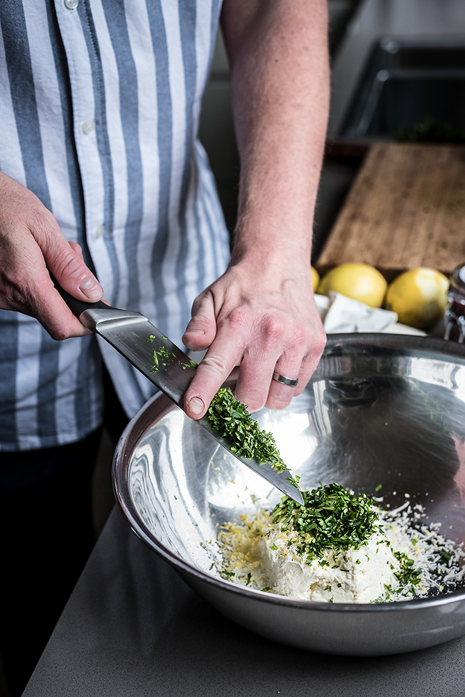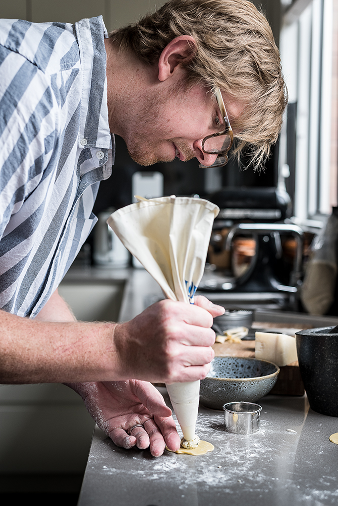 Make the pasta dough and let it rest in the fridge overnight. Mix together the filling and place in a piping bag.