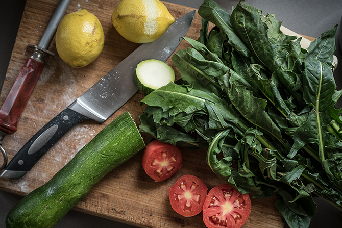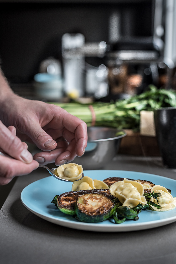 Plate up the zucchini and chicory as suits your style. Add the ravioli.