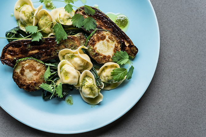 Travis’ Pecorino + Mint Ravioli, Chicory, Zucchini, Salsa Verde