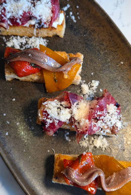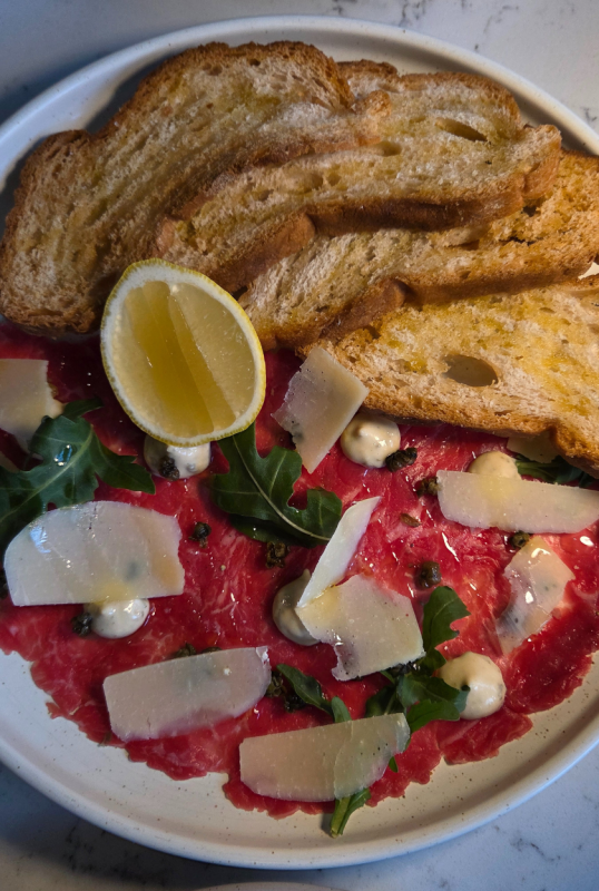 Entrées then include Toasted Brioche with anchovy and tarragon butter, Wagyu bresaola, goat curd, aged balsamic and parmesan, followed by Gin-cured Kingfish Crudo with pink peppercorn, fennel, citrus and green olive, Beef Carpaccio with anchovy mayo, baby capers, rocket and crackers, and Tempura Eggplant with yuzu miso, jalapenos, pickles, aioli and walnuts.