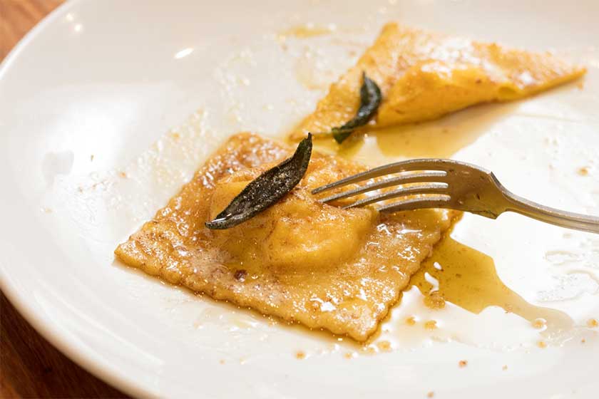 Briscola’s Pumpkin and ricotta-filled ravioli with burnt sage butter and amaretti biscotti.