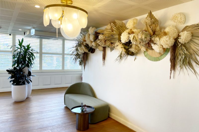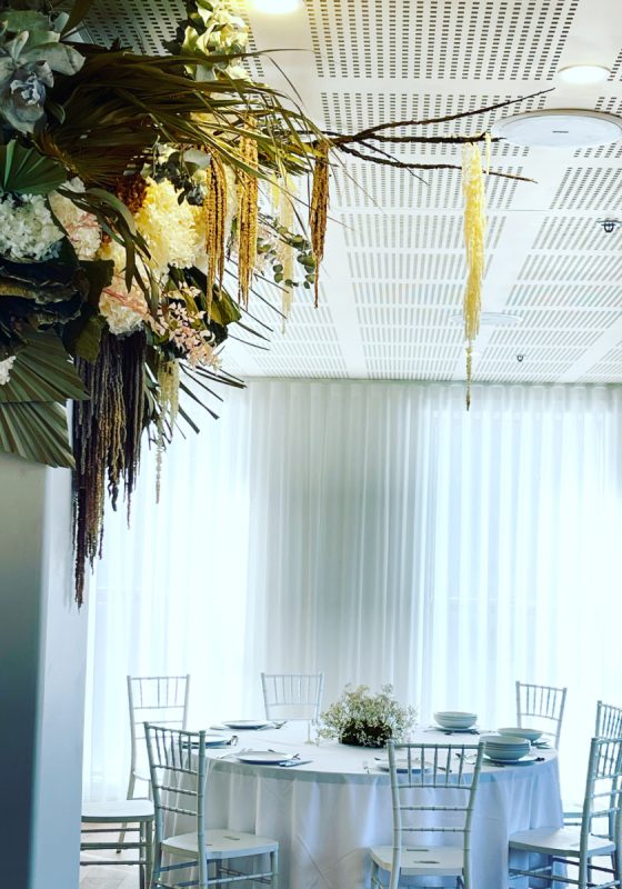 And above that awaits “Rito”, the vast event space, where the scenery changes to oak floors, velvet sofas, oversized pot plants, an enormous brass bar, and imposing dried floral installations from Wiluna Studio hanging from the walls and ceiling. Here is an inner-city wedding venue worth getting hitched in front of 250 of your nearest and dearest.