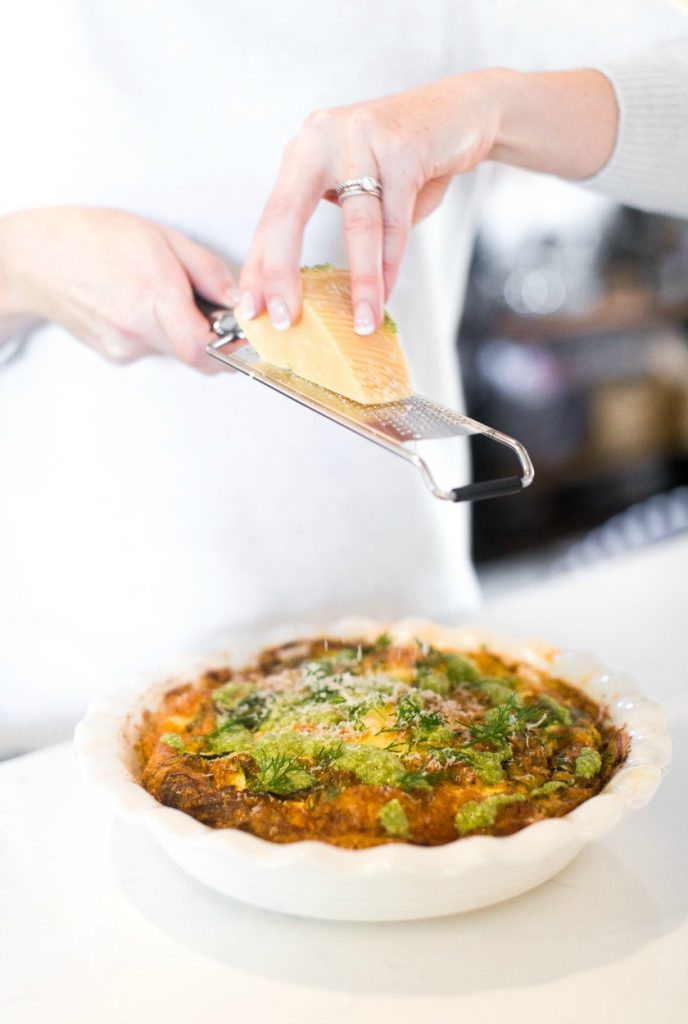 To serve: Serve frittata hot, with fresh dill, grated pecorino and green chimichurri.