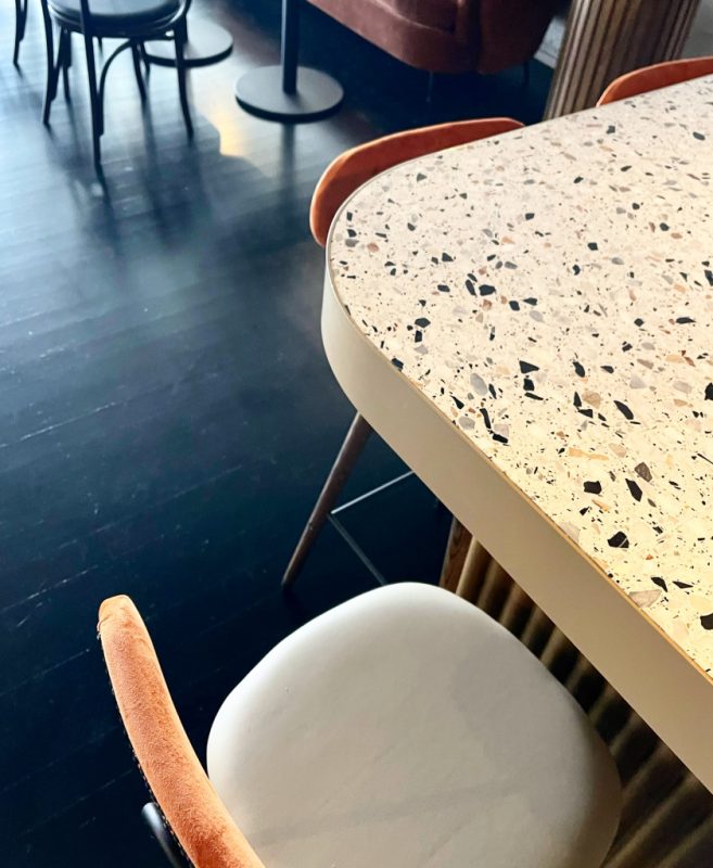 Designed by Capezio Copeland, upstairs has an industrial luxe feel with a terrazzo bar, brass accent lights, curved wood tables and velvet and leather chairs and sofas.