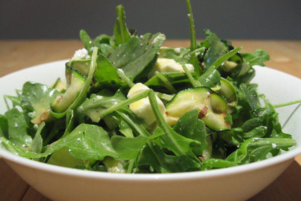 Mix the cooked zucchini, the leaves and the dressing together just before serving.
