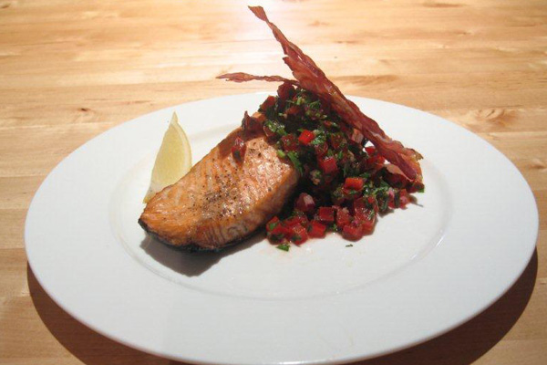 To serve, place the salad in a pile in the middle of the plate and place the salmon on top. Drizzle the salsa on the side of the fish and finish with the super crispy prosciutto.