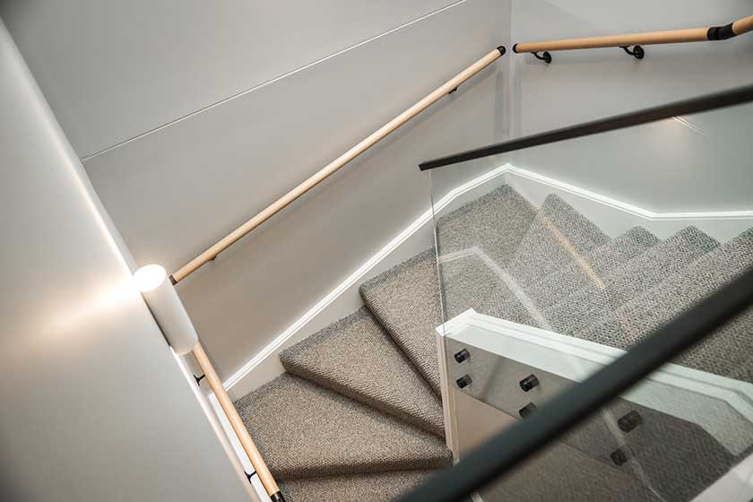 The formerly conventional closed-in staircase has been made a central feature of the home, remade in glass and illuminated by another two skylights and the bedrooms are elegant sophistication.