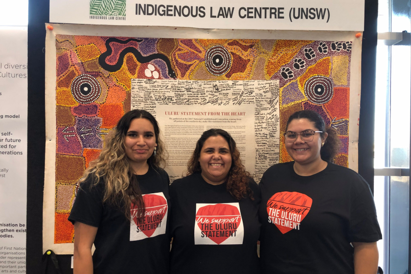 (Left to right) Allira, Anangu Pitjantjatjara Yankunytjatjara Executive Board Council’s Sally Scales and Bridget educating people about the Uluru Statement at the Darwin Arts Fair in 2019.