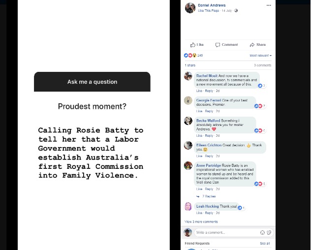 By January 2016, she had spoken at approximately 250 events and addressed more than 70,000 people. She had also inspired Victorian Premier Daniel Andrews to commit to an Australian-first Royal Commission into Family Violence (see Facebook post below).