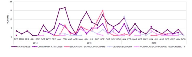 An analysis of media coverage between 2014 and 2016 found that 95,261 media reports mentioned Batty and that as the level of interest in the issue increased, the nature of the discourse changed. For example, media coverage regarding general awareness decreased as strategies for reducing DFV, including school programs and gender equality, grew in profile (see Figure 2).