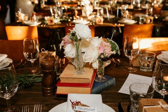 “As soon as we saw the space, we knew it was exactly how we pictured our reception venue. The reception looked amazing. From exposed timber rafters complete with fairy lights and natural plants, to the beautiful wooden tables, furniture pieces and flooring. The styling package from dream.hire.design worked really well with the venue features. We wanted to create a welcoming feel and the hanging jars, vintage books stacked on the tables combined with teacups of flowers created incredible imagery when we entered.”