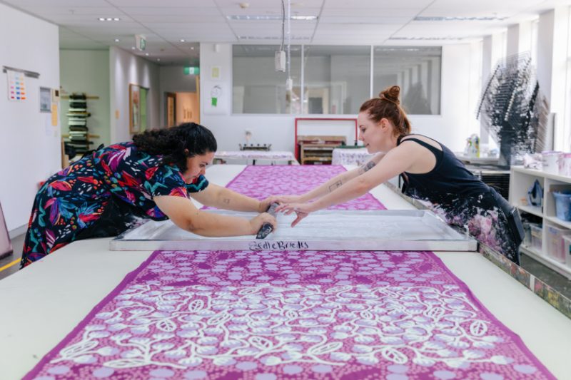 Kayannie Denigan and Estelle Briedis screenprinting. Image by 5 Foot Photography