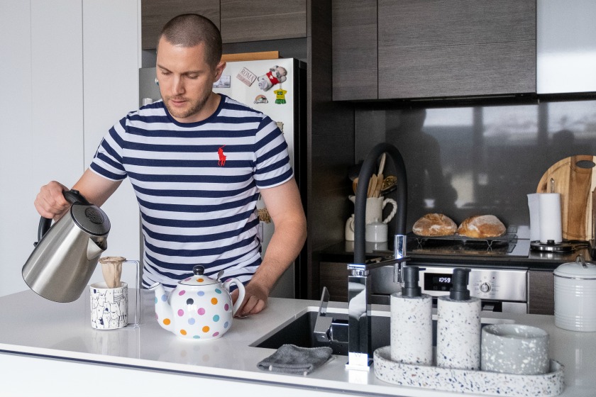 That was easier said than done though, and instead the couple have temporarily moved into a single bedroom high-rise apartment. At first it was a struggle, especially as Simon had a whole bunch of man cave stuff and not everyone wants to sleep next to a salty bodyboard collection with pointy fins.