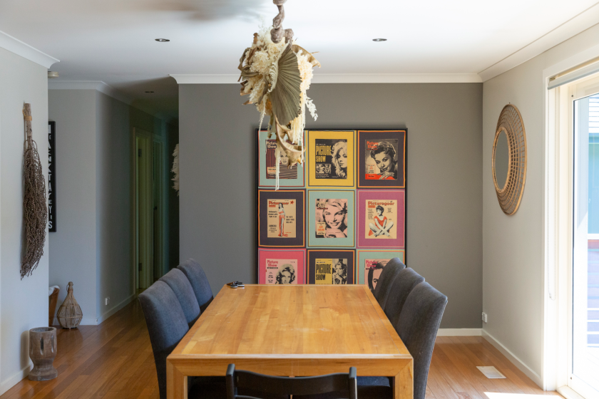 “We’re really happy with our home and love everything about it,” says Mel. “Perhaps aside from the main living room’s high-angled ceilings, which does make the TV look like an altar.”
