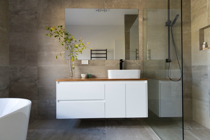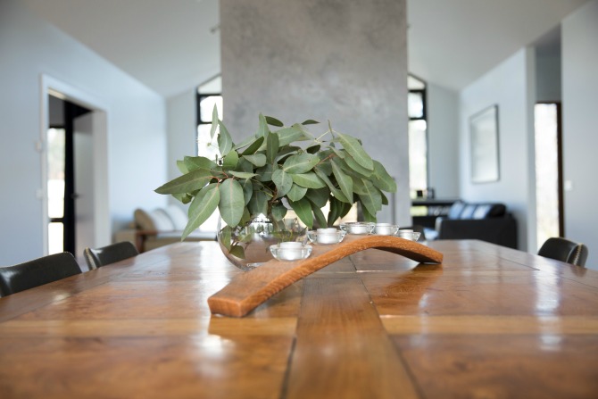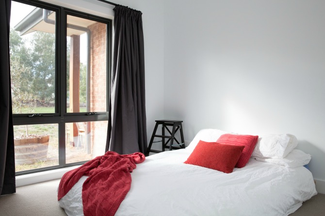 Being a bit of a handyman, Rob made all the wooden lamps by hand, designed and created the bedhead and base (from wood cut and milled at Jo’s parents’ farm in Tasmania) and even did the bathroom bench tops. He said he really didn’t know what he was doing, but I think he was just being modest (after all, the bed withstood the process needed to increase Gundaroo’s population).