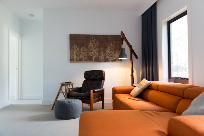 Actually what is cooler than the name Big Bertha is how they styled the home with a modern take on country styling. Think classic wood contrasted with modern light pendants, and a soft neutral colour palette paired with strong pops of colour—like the orange lounge or the deep-blue bedroom curtains.