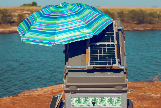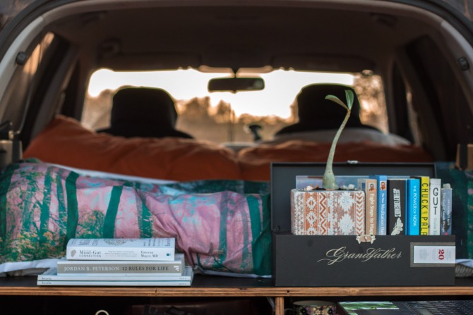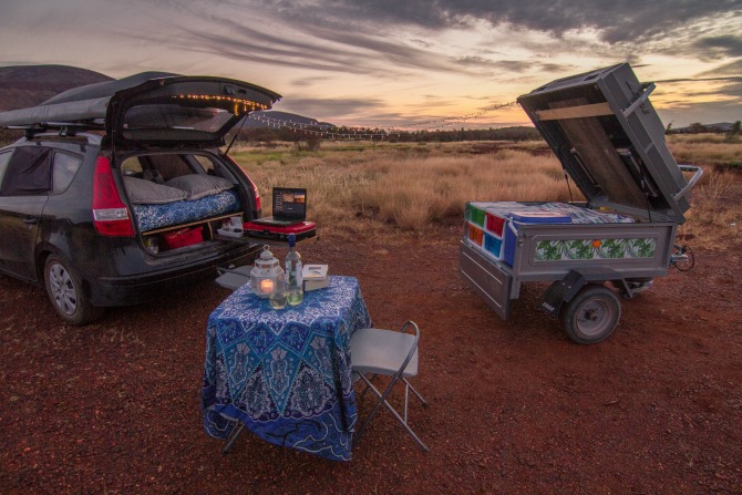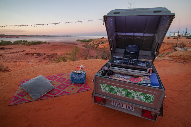 He also built a solar battery system into the trailer, which runs the media production studio, charges all camera gear and makes sure those pretty fairy lights stay on. And, as an ode to me, he also built a fold-down DJ booth, with decks and a sound system that all runs completely off-grid. At least I’m assuming it’s an ode to me—and if this party on wheels isn’t called ‘Ashley’ then I need to rethink the whole friendship thing.
