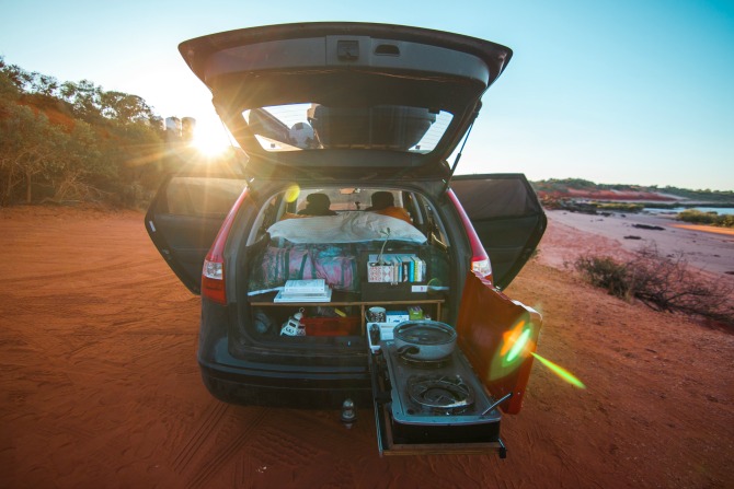 Michael took the back seats out of a standard family wagon, built a platform for a bed, added storage drawers under the bed and a slide-out gas cooker at the back. He then modified a tiny French trailer to carry a fridge and act as a kitchen with drawers.