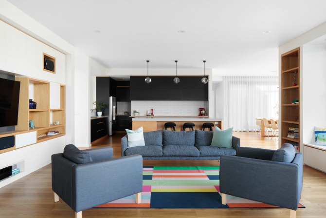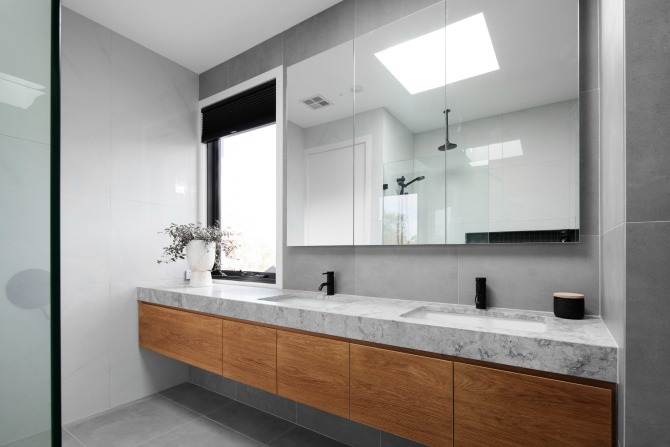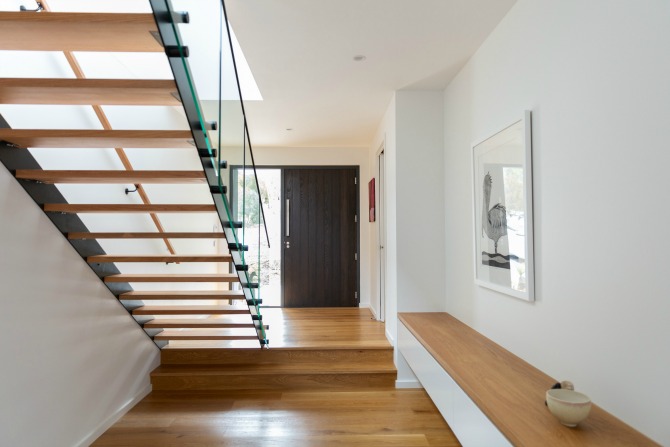 The couple worked with Paul and his partner, interior designer Vanessa Hawes, to develop a design guided by four principles: contemporary, spacious, personal and practical. Contemporary in the sense that the home is full of clean lines and calm neutral tones; spacious in terms of long extended living space; personal in terms of quirky touches like the neon light wall quote; and practical in that the full living space is upstairs (after all, that’s where you’ll see the best view of the mountains, gardens and rooftops).