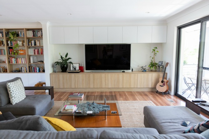 I’ll let Cass’ superb photos do the talking as to the look and feel of the house, but you’ll notice that the living space is open and airy, with the kitchen placed so it connects to the back deck via a set of foldable windows. There are lots of sunken shelves, little nooks and spaces that allow for storage or display without clutter. Speaking of displays, did you spot the Star Wars Millennium Falcon under the coffee table?