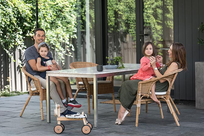 Lisa loves it when the family congregates to eat outdoors under a huge covered terrace that includes a neat outdoor kitchen directly connected with the main kitchen. Together, they oversaw the selection of the home’s palette of white, greys and oak. The herringbone floor is carried through in a marble herringbone tile in bathrooms, while v-groove panelling is used in the kitchen joinery, on all the internal doors and dark grey externals.