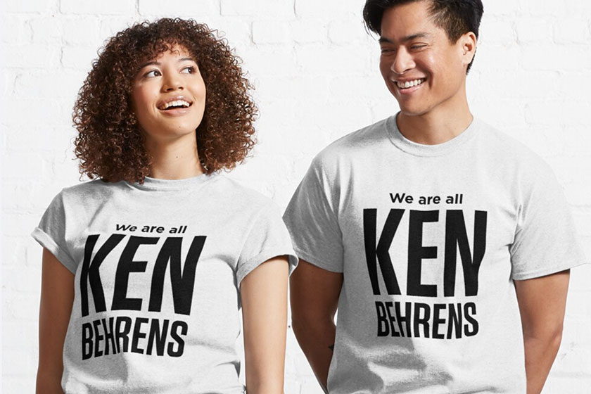 A quick search of RedBubble shows scores of tees, caps, mugs, masks and more, all proudly emblazoned with the Ken Behrens name.